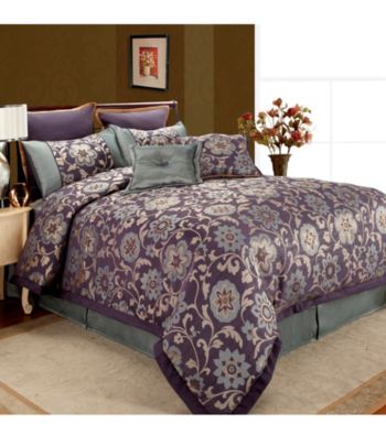 Bedding. Web exclusive! Love the look of your bedroom again with this floral comforter set by Home Fashions International. Showcase your bed in midnight purple and taupe with the Chantilly comforter set. This Home Fashions International bedding pattern uses a beautifully crafted floral and vine pattern for a regal look. Top your new bed with the two decorative pillows for cozy yet stylish comfort. Available in Queen and King sizes Queen: 92x96" comforter; bed skirt with a 15" drop King: 108x96" comforter; bed skirt with a 15" drop Set includes comforter, bed skirt, two … Read more