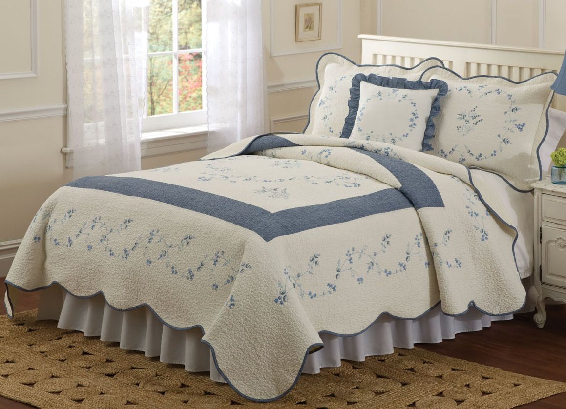 A classic floral quilted bedding collection in denim blue and white, the American Traditions Forgetting Me Not bedding ensemble will transform your bedroom into a fresh and quaint retreat. Available in Full-Queen and King size, the American Traditions Forgetting Me Not quilt is adorned in a delicate floral pattern in denim blue on a white ground complemented with a broad denim blue frame on the face accented with scalloped denim blue edges. Read more