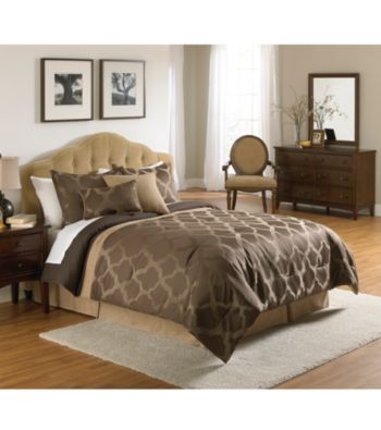 Bedding. Exclusively ours! Bring modern elegance into your bedroom with the Presidio bedding set, a beautiful jacquard pattern in sateen fabrics. The woven jacquard look of Presidio makes this comforter set feel upscale. Each piece in the set, from the comforter to the bed skirt, is touched by classic khaki and other shades of brown. A unique pattern on the comforter, shams and one decorative pillow add a beautiful look. Available in Full, Queen and King sizes Full: 86x86" comforter; 54x75" bed skirt with a 15" drop Queen: 88x90" comforter; 60x80" bed skirt with a 15" … Read more